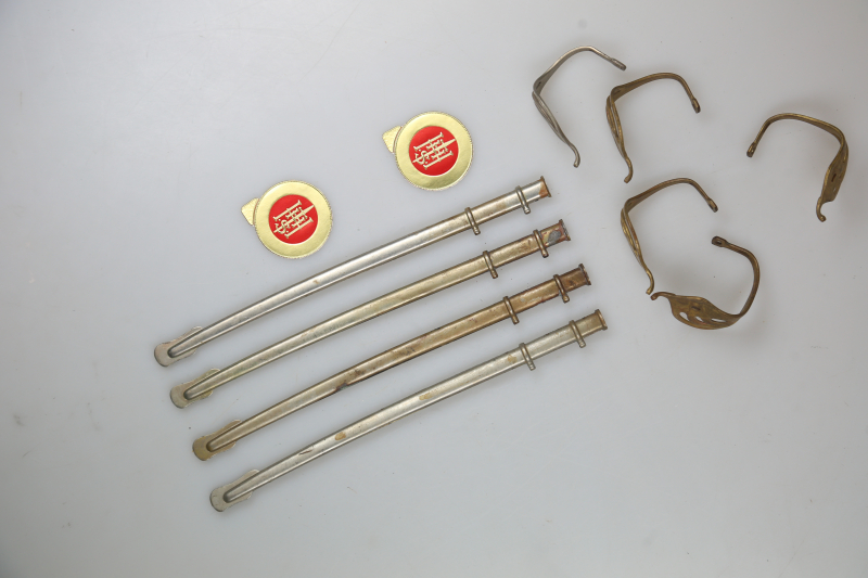 Konvolut Miniatur-Ersatzteile für Säbel – 4 Scheiden, 5 Gefäßteile, 2 Hörster-Aufkleber