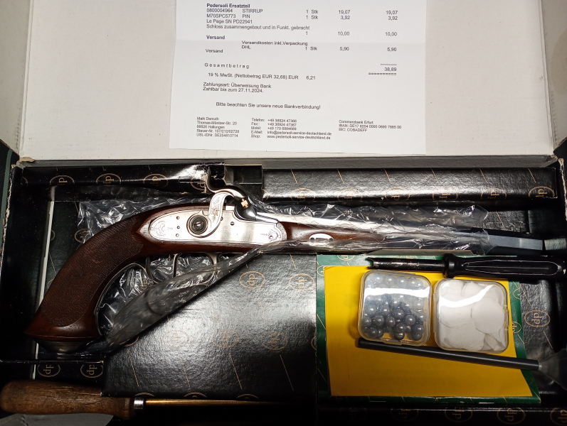 Biete hier eine Pedersoli Le Page Target International in der original Verpackung, mit dabei Zubehör wie Ladestock, Pulvertrichter, Kugeln in .362, die passenden Läppchen in 0,27mm. An der Waffe wurde Ende 2024 im Abzug Teile erneuert, Rechnung anbei. Die Pistole schießt top, alles funktioniert wie es soll. Bis auf ein paar kleine Eindrücke im Holz in neuwertigem Zustand. Da ich komplett auf Unterhammer umsteige ist dieses Schätzchen abzugeben.Habe die Waffe das letzte Mal im August 25 geschossen, Schußbild siehe Bilder. Bei Fragen Nachricht an mich. Da Privatverkauf keine Garantie und oder Gewährleistung sowie Rücknahme.