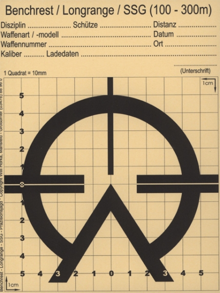 Diese Scheiben sind mit einem 10mm Rastergitter überzogen, somit läßt sich jeder Streukreis, jede Abweichung sofort in mm-Angaben erfassen u. auswerten, jeder Schütze kann daraufhin seine Optik gezielt verstellen.