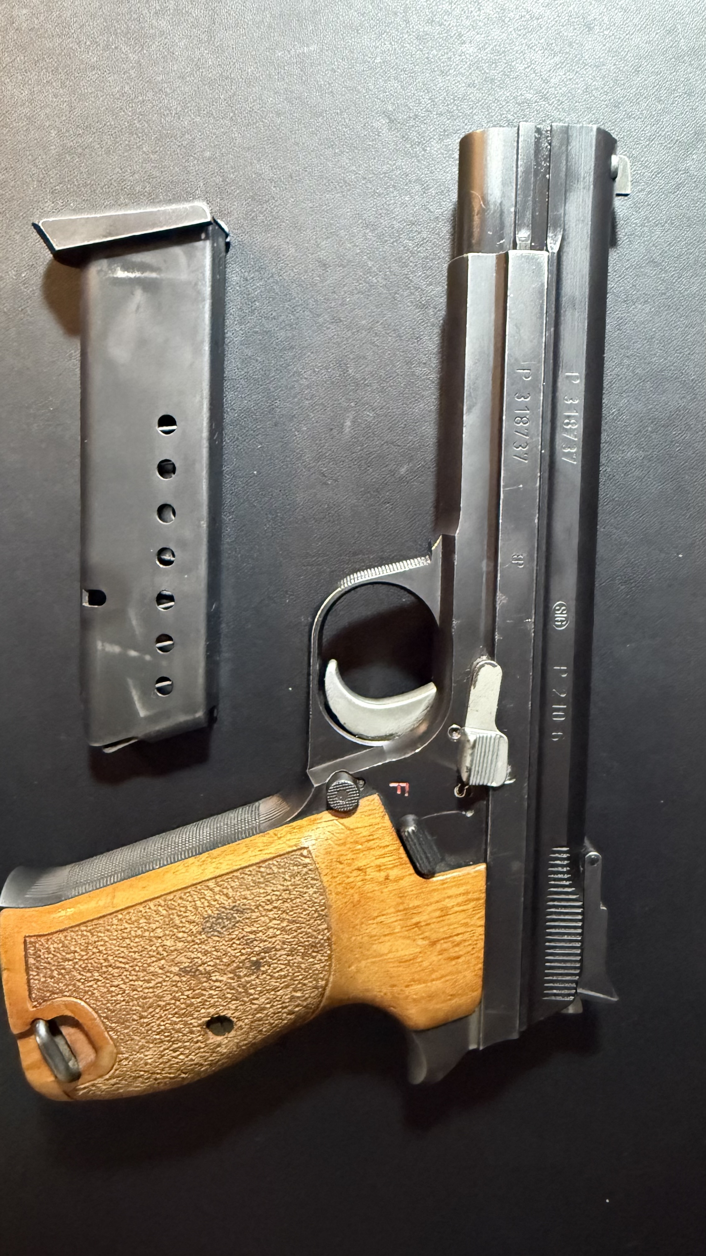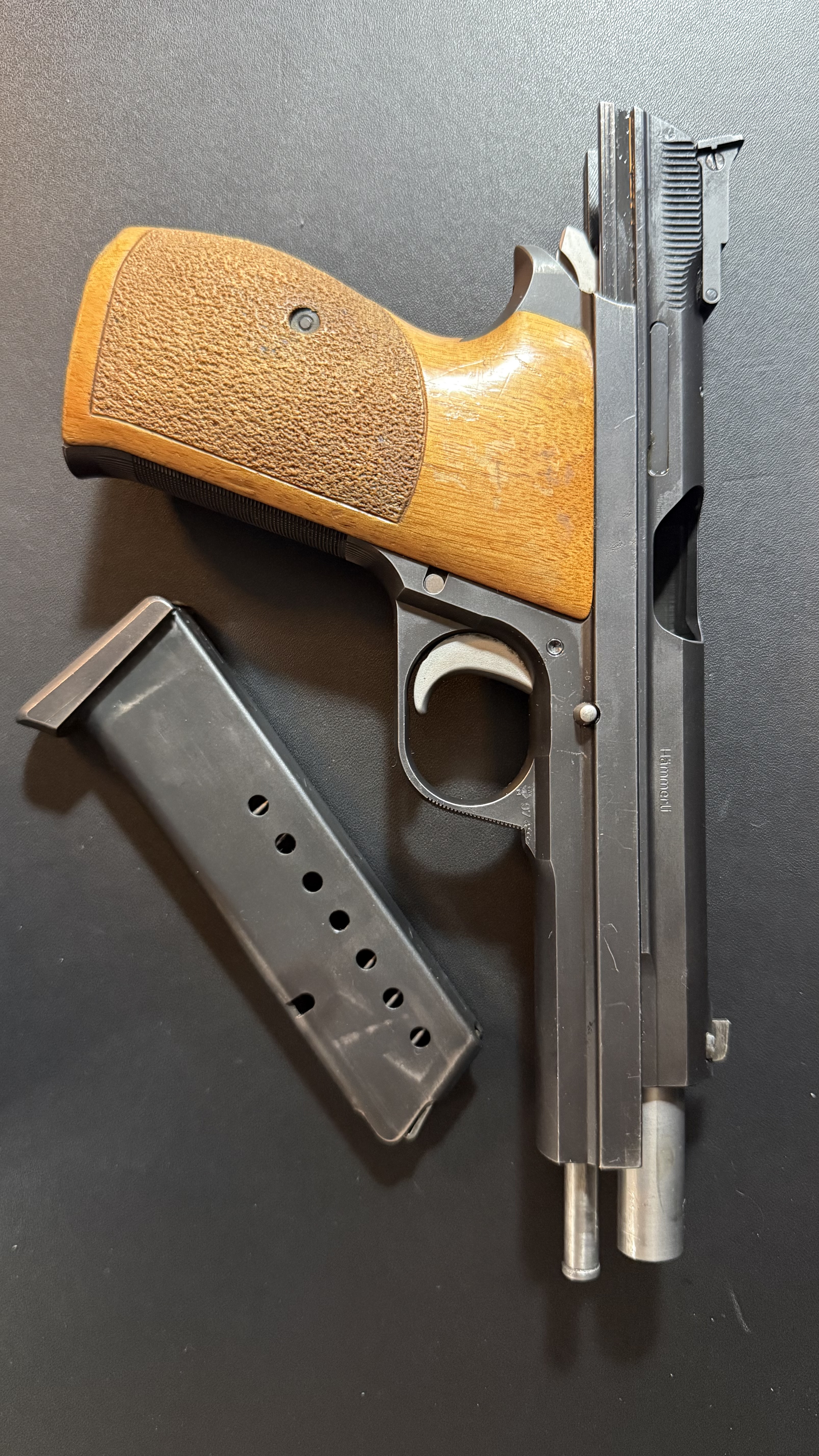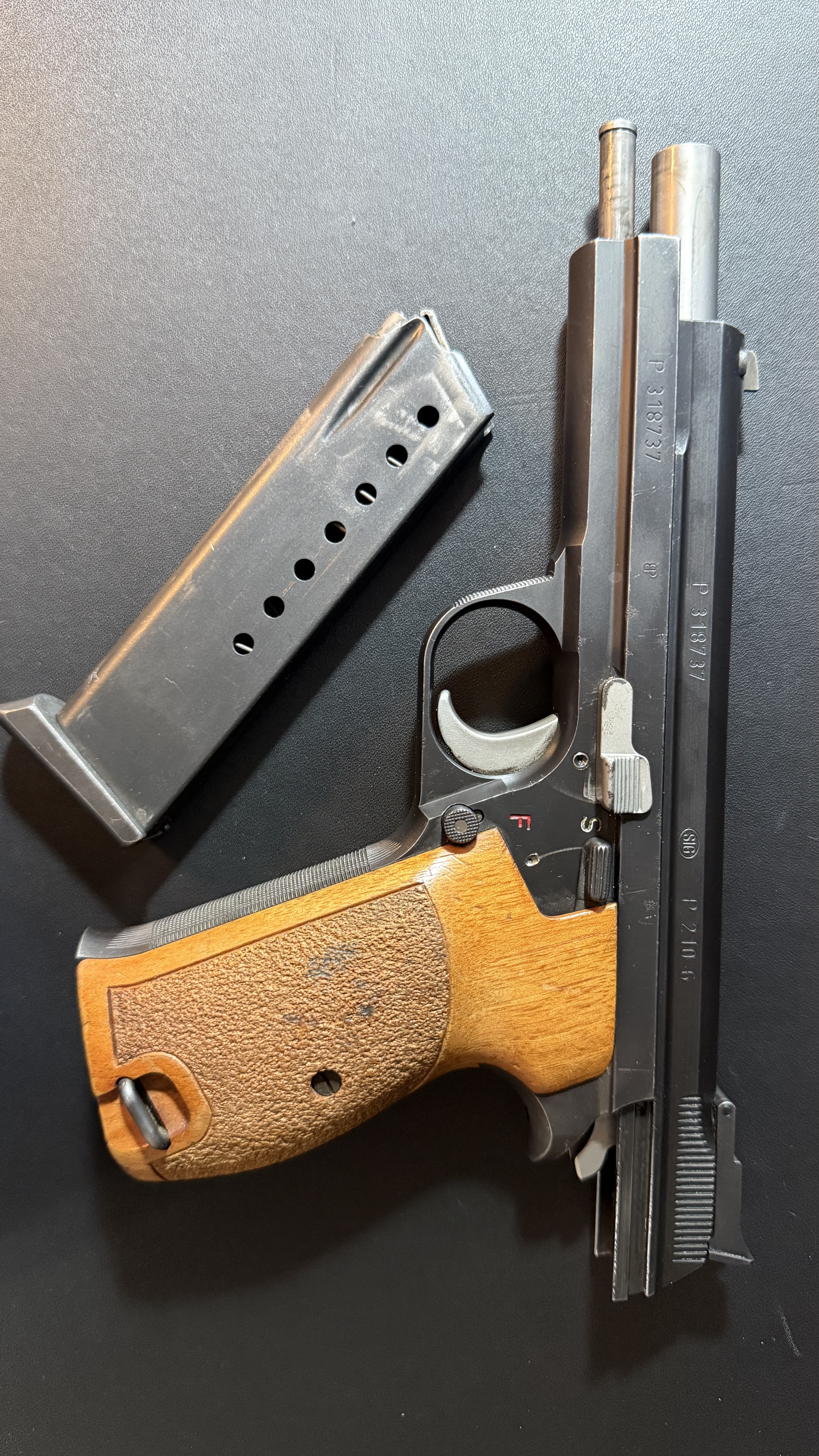 SIG P210-6 | 9 mm | gebraucht | nummerngleich - Oschatz getuned mit Nil Holzgriff, SIG Hämmerli Wechselsystem .22lr