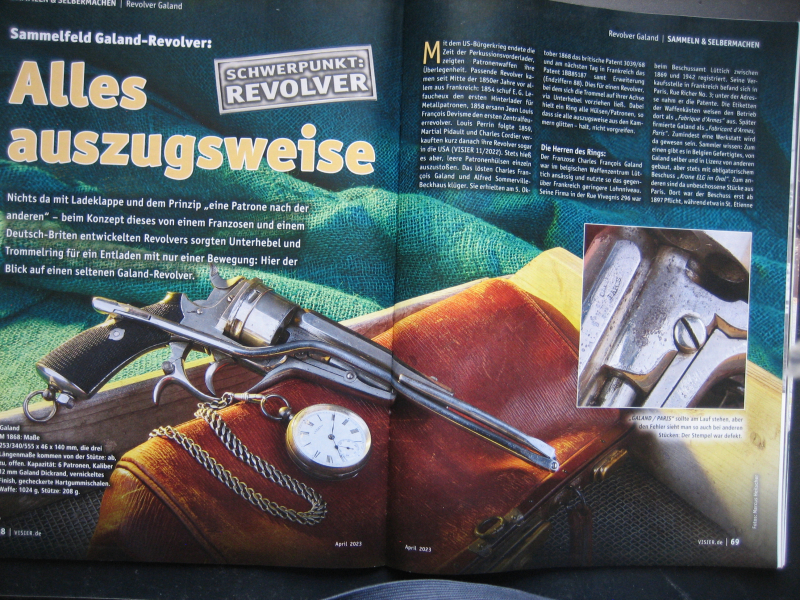 Für Waffenfreunde und Revolverschützen +++ angeboten wird ein Visier - Heft/SWM-Teil; mit einem besonders sehr interessanten Bericht ++ ** Die Galand - Revolver ** -- Das Sammelfeld der Galand - Revolver mit ihrem ausgeklüngelten Ausziehersystem -- Nichts da mit Ladeklappe und dem Prinzip "eine Patrone nach der anderen" - beim Konzept dieses entwickelten Revolvers sorgten Unterhebel und Trommelring für ein Entladen mit nur einer Bewegung. -- Wie der seltene Galand-Revolver funktionierte, können Sie in dem Bericht (5 Seiten) nachlesen.+++ und es gibt noch weitere interessante Beiträge - auch im SWM Teily+++ Das Heft ist gebraucht ; befindet sich aber in einem sehr guten Zustand. +++ Der Versand erfolgt als Großbrief mit DHL (unversichert) ; die Versandkosten gelten nur für Deutschland.+++ Bieter aus dem Ausland bitte Versandkosten vor Gebot erfragen. +++ Versandrabatt möglich, sehen Sie auch meine anderen Angebote. +++ Privatverkauf, daher keine Gewährleistung, Garantie oder Rücknahme. 4023 +++ Fragen bitte mailen.