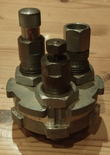 Ich verkaufe hier meine Wiederladeausrüstung, den Start machen die Pressen. Angeboten wird eine Kopfplatte für eine 3-Stationen-Presse mit einem Matrizensatz in .38/.357.