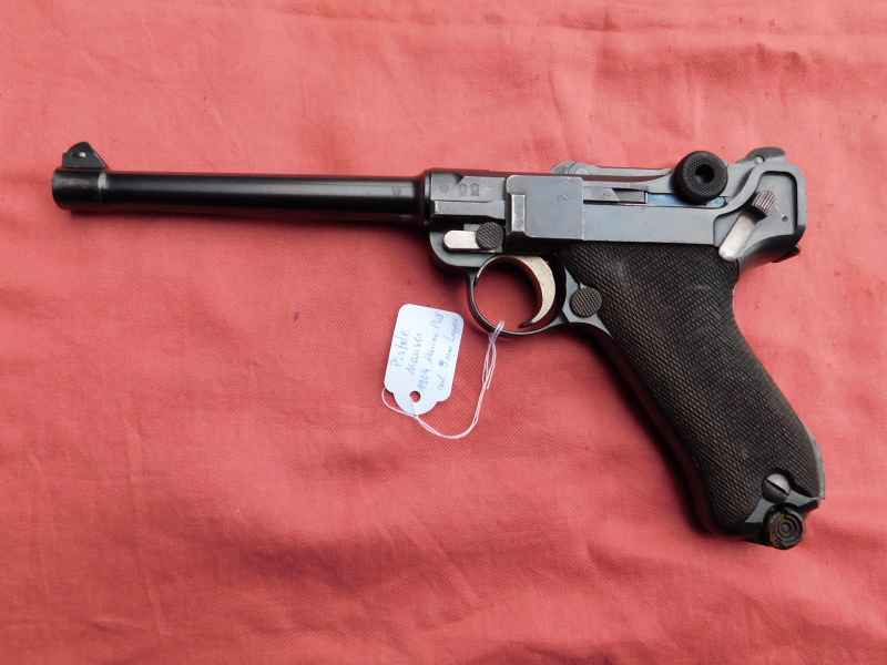Unsere stammt aus einer Sammlung. Der Lauf ist innen spiegelblank und das Profil scharf. Minimale Rostnarben an der Nut für den Anschlagschaft. Ich würde sagen original Streichbrünierung. An der Laufmündung und Seitenplatte ist die Brünierung etwas berieben. Noch keine Jahreszahl, lt. einem "Lugerbuch" so gebaut!