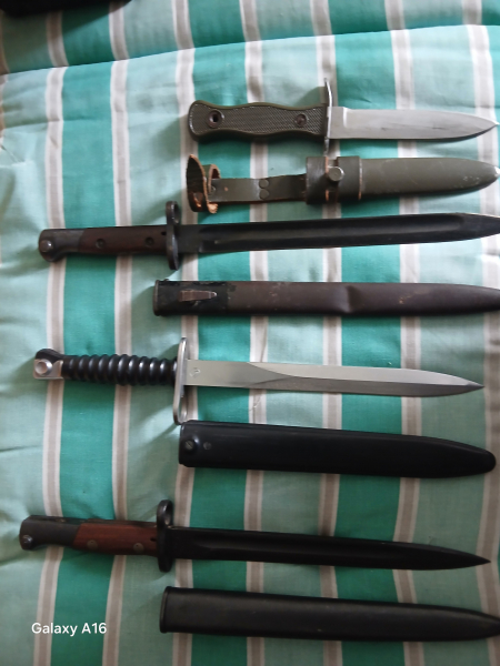 Zum Verkauf kommen aus einem Nachlass Gegenstände meines Vaters die ca, 10 Jahre ungenutzt in meinem keller liegen und ich sie nicht benötige. Evt. hat ein Sammler oder ein Messerliebhaber Interesse.Über diese Gegenstände kann ich keine Aussagen machen woher sie sind und welche Kriege sie gesehen haben, eines düfte BW sein.