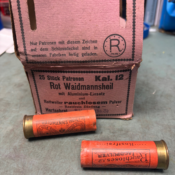 Angeboten wird eine sehr alte Schachtel mit 25 leeren Schrothülsen kal. 12 der Marke Rottweil in rot. Das Besondere, diese Papphülsen haben einen Aluminium Einsatz zur Verstärkung . Zustand siehe Bilder. Bodenstempel „Köln-Rottweil Aktiengesellschaft“. Diese Firmung gab es laut web nur bis kurz nach dem WK II , ! ! Alter über 70 Jahre ! Die Hülsen sind gezündert, aber diese sind überaltert ! Mit Glück könnte etwa 1 von 10 noch zünden. Privatverkauf, keine Garantie oder Rücknahme ! Versandkosten gelten NUR für versicherten Versand auf deutsches Festland. Auslandsversand nur auf Anfrage ! ! !
