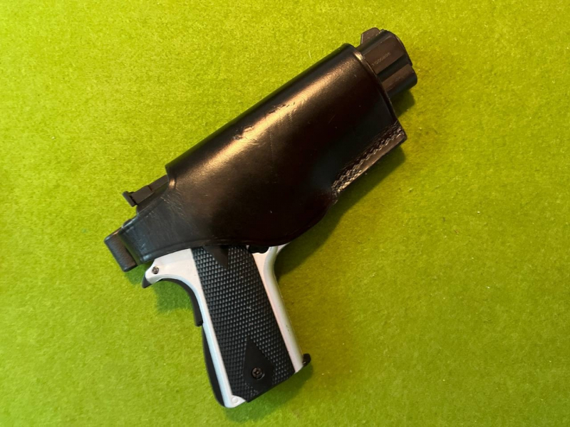 hat das Model der 1911 im Titelbild gut gepasst, und selbstverständlich kann das Holster für die sehr ähnliche Modelle von S&W 39 und 59, hier ein Beispiel mit einer SSW- Ausführung