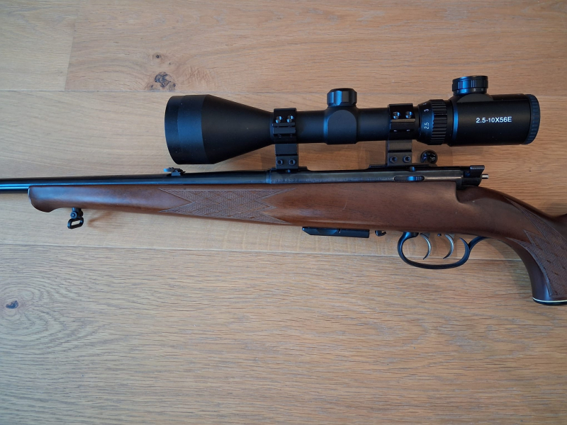 Gesamtlänge 107cm, Lauflänge 60cm, Schaftlänge 36cm, Deutscher Stecher, Zielfernrohr Bearstep 2,5-10x56 Abs.4 Leuchtpunkt.