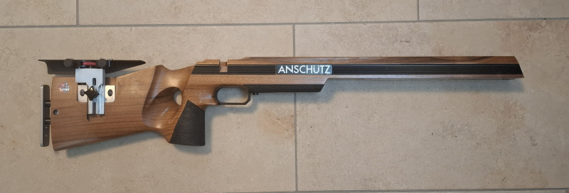 gut erhaltener Lochschaft für Auflage konzipiert, abgeflachter Vorderschaft für tief liegenden Schwwerpunkt mit T-Nutschiene, ergonomisch angepasster Hinterschaft mit fein einstellbarer Schaftbacke, Anschütz Schaftausleger