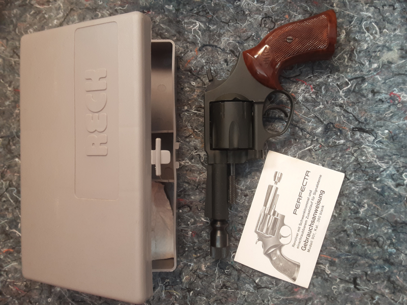 Signal Revolver Perfecta 901 Kaliber .380 Knall in gebrauchtem Zustand. Mit Schwenktrommel und einschraubaren Zusatzlauf für Signalsterne. Double Action Revolver mit der alten PTB 228. Noch echte Made in West Germany Qualität. Die Trommel fasst sechs Kartuschen. Kleine Laufsperre, lässt sich gut reinigen. Ich habe damit nicht geschossen. Trockenfunktion ist gegeben. Oberfläche ist noch recht schön, Schmauchspuren an der Laufwurzel / Rahmen. Sieht nach all den Jahren noch recht gut aus. Anleitung, Becher und Box.
