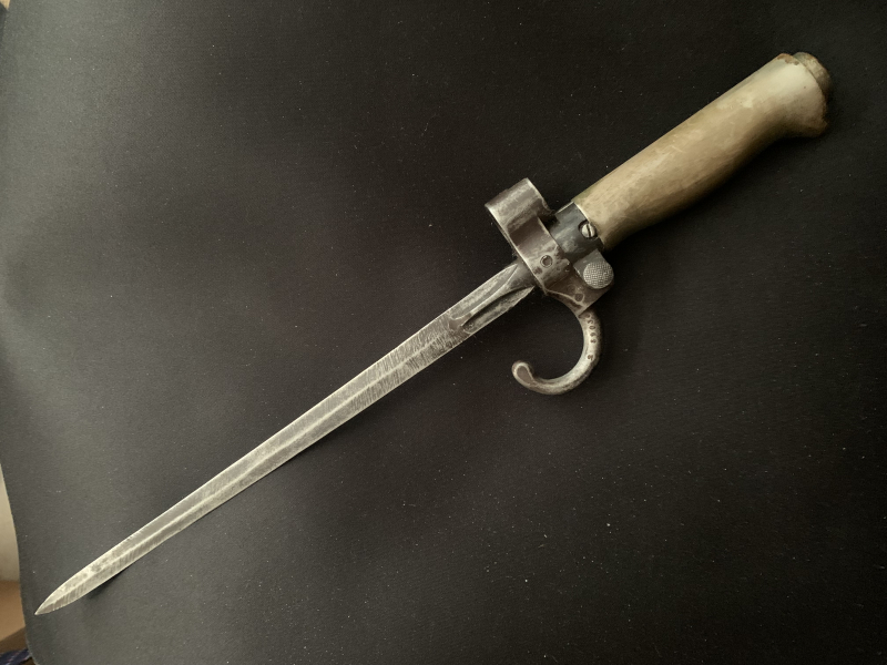 Frankreich, Epee Seitengewehr Modell 1886 Lebel. Klingenlänge 24cm. Weißmetallgriff mit Parierhaken verschiedene Punzen und Zahlen sind zu sehen. Die Scheide fehlt.