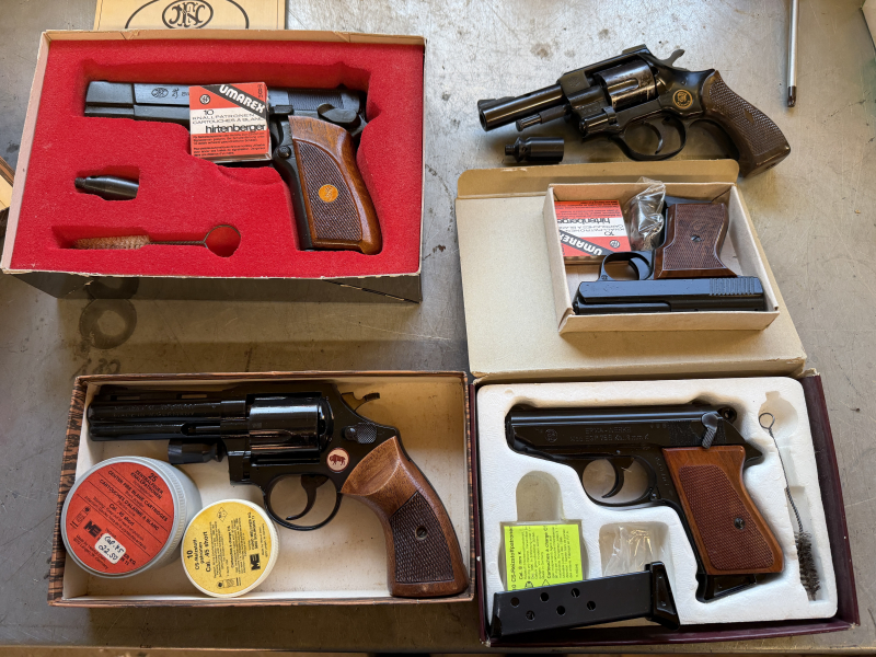 Verkaufe hier ein Konvolut aus verschiedenen Schreckschuss Waffen alle haben ein PTB.Die Waffen haben das Kaliber .45 Rand, 9mm Rand, 8mm Pak, 6mm Rand dazu gibt ea noch eine CO2 Revolver 4.5mm Luftdruck Revolver.