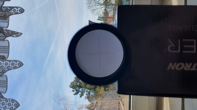 Das Zielfernrohr verfügt über ein MTR1-Absehen in der zweiten Bildebene und kann in Rot mit fünf Helligkeitsstufen beleuchtet werden. Eine kaum gebrauchte CR2032-Batterie ist enthalten.
