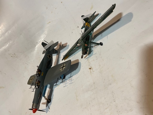 2 Modell Flugzeuge - sehr detailreich mit Staffel Abzeichen - Spannweite 19cm - bei dem Fieseler fehlt 1 Fahrwerk - bei dem Nachtjäger fehlt 1 Propellerblatt - Alles aus Kunststoff in sehr gutem gebrauchten Zustand - Paketversand 9,90 Euro mit DHL in der BRD - Bei unversichertem Versand übernehme ich keinerlei Gewährleistung - Bei Geboten auf weitere Artikel Unkosten erfragen. Unklarheiten vorher klären und nicht hinterher beschweren. Mit Abgabe des Gebotes akzeptieren Sie die angegebenen Versand und Unkosten sowie die Verkaufsbedingungen.