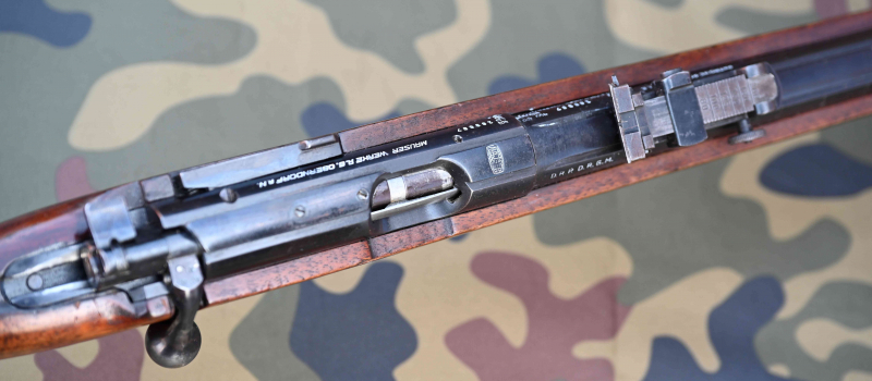 "MAUSER"-Banner auf der Hülsenoberseite. Patenthinweise rechts auf der Laufwurzel "D.R.P. D.R.G.M." = Deutsches Reichspatent, Deutsches Reichs-Gebrauchsmuster.