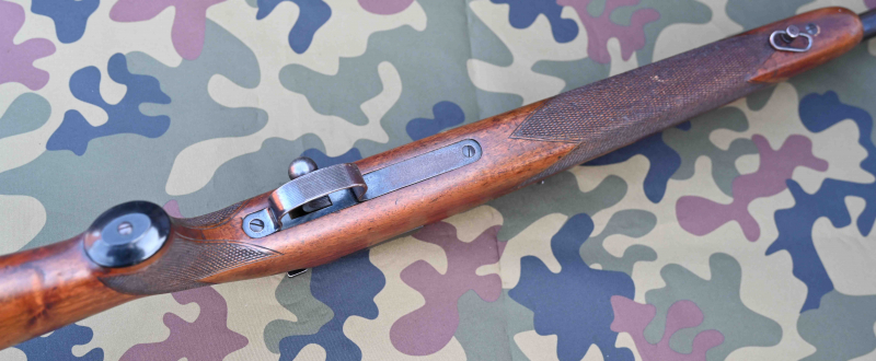 Schaftholz prima erhalten, mit normalen, harmlosen, insgesamt wenigen Gebrauchsspuren. Feine Fischhaut am Pistolengriff und am Vorderschaft. Mit 2 Riemenbügeln.