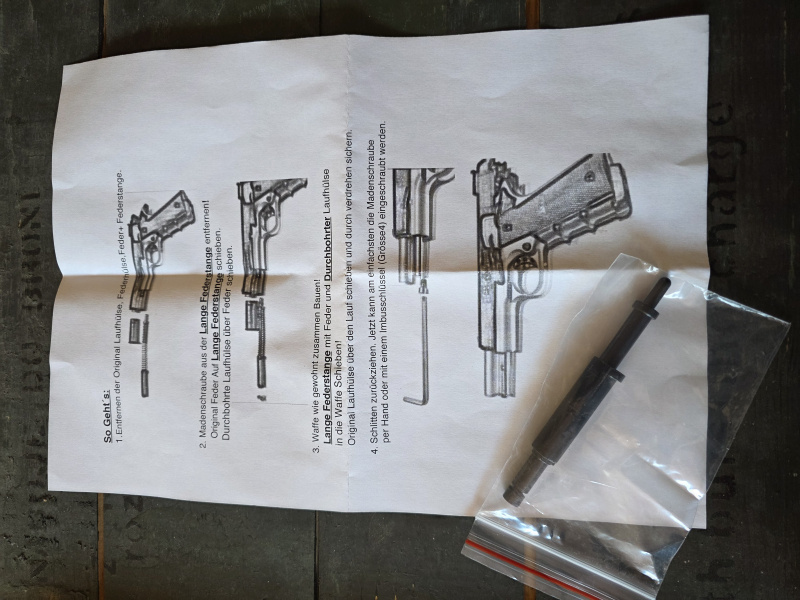 Die Federführungsstange ist aus Stahl gefertigt und brüniert. Im Lieferumfang ist darüber hinaus auch die dazugehörige Einbauanleitung enthalten.