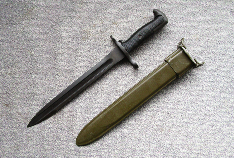 Biete hier das originale Bajonett zum US-Garand M1 Selbstladegewehr an, Hersteller UC 1942 ( Firma Utica Cutlery Company 1942 ), sehr seltener Hersteller, sowie der US Abnahmestempel „Flaming Bomb“ auf der Scheide, original 2. Weltkrieg-Fertigung, sehr guter Zustand, ein kleiner Ausbruch an einer Griffschale, siehe auch die Fotos dazu, Fragen hierzu gerne per email, allen Bietern viel Erfolg, Auslandsversand bitte vorher erfragen, vielen Dank !