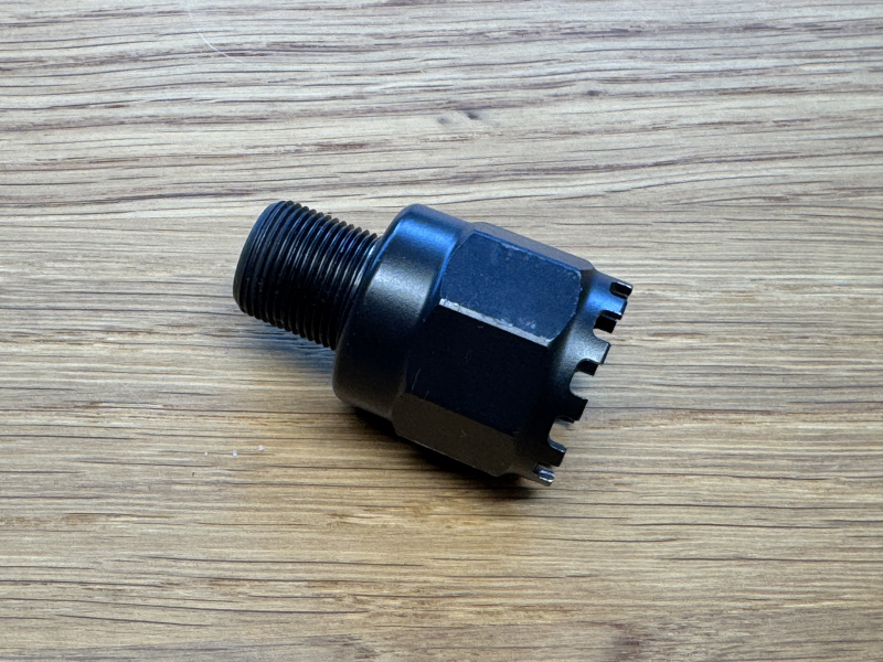 Zur Versteigerung kommt ein Adapter aus Stahl von M24x1,5 auf 5/8x24. Der Adapter wurde/wird von MGB Strategic vertrieben. Auf der Seite des M24x1,5-Gewindes befinden sich Aussparungen, in die der angefederte Haltestift an der Mündung von AK-Klonen mit M24x1,5 Mündungsgewinde hineingreifen kann, um den Adapter zu fixieren. Auf diese Weise kann man jeden SD mit einem gebräuchlichen 5/8x24-Gewinde an seiner AK47-Klon-Büchse verwenden. Ich habe meine AK verkauft und benötige den Adapter daher nicht mehr. Er hat leichte Gebrauchsspuren vom An- und Abbauen.