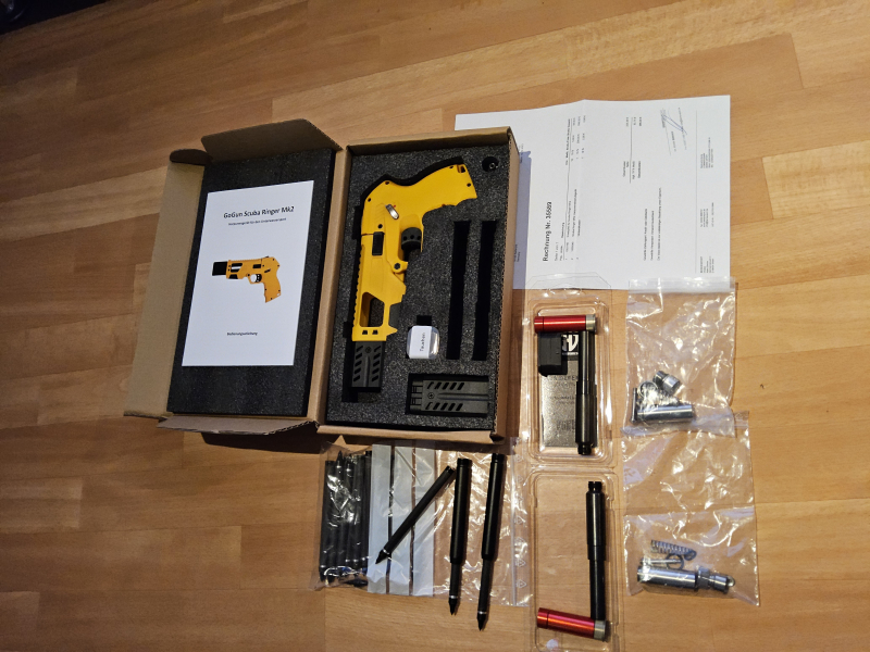 Verkaufe neue AEA Scuba Ringer MK2 mit Rechnung. Alles im Orginal vorhanden : plus 16 Pfeile, plus 2 Zusatzkartuschen 600 bar, plus 2 lange Tuning Abschußrohre. Alles neu und unbenutzt im Wert von 500 Euro. Viel Spaß beim bieten !