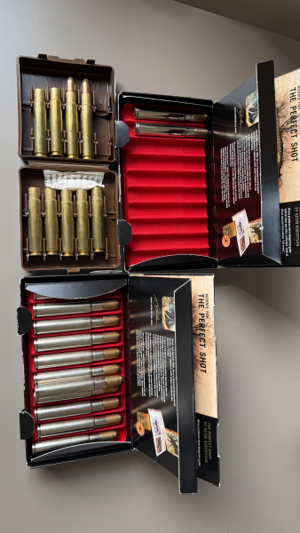 Sie bieten auf eine geöffnete Originalschachtel Norma African PH Vollmantel mit 10 Patronen+1 Patrone separat sowie auf eine geöffnete Originalschachtel Norma African PH Bleispitze mit 2 Patronen, sowie 2 Patronen mit Gravur von Waffen Daurer mit Bleispitze