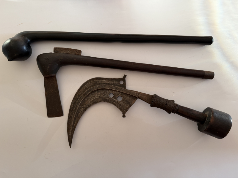 ein Mangbetu, eine Zeremonienaxt und ein Streitkolben. Alter unbekannt. Die Teile entstammen der Erbschaft meiner Eltern. Diese sind viel gereist und haben viel gesammelt. Es ist nicht mein Geschmack und zu schade für die Mülltonne. Deshalb hier für den geneigten Freund oder Sammler.
