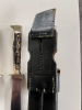 Ich möchte mich von einem rarem, sehr frühen Waidbesteck aus den 50er Jahren trennen. Für das Alter in einem sehr schönem Zustand. Es befindet sich im Fundzustand. Wer möchte kann es an einigen Stellen (Griff) polieren oder den Grünspan entfernen. An der Scheide hat sich an der Rückseite ein Faden leicht gelöst, dem Alter geschuldet. Dürfte auch kein Problem darstellen. Die Klingen scheinen meiner Ansicht nach nicht geschliffen worden zu sein. Aber beurteilt das bitte selber. Keine Zusage von mir. Der Clou ist jedoch die Adelskrone auf der Monogamplatte! Es handelt sich um eine neunzackige Krone, die für den Grafenstand verwendet wurde. Leider konnte ich die ursprüngliche Herkunft nicht ermitteln. Ein Waidbesteck aus dieser frühen Fertigung in dem angebotenen Zustand dürfte nicht so einfach zu finden sein. Fragen bitte vorher stellen!