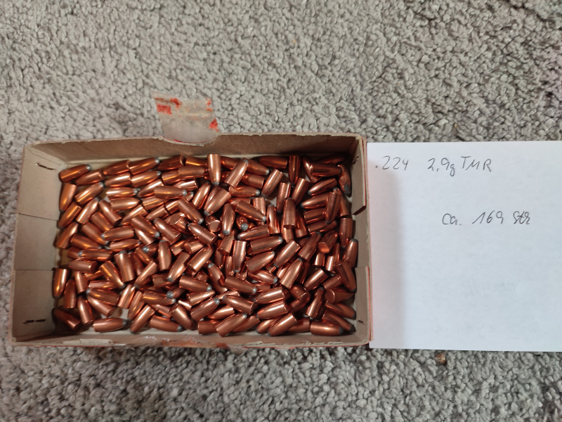 Ich muss aufräumen. Sie bieten auf ca. 160 Geschosse Kaliber .224 mit 2,9g TMR für .22 Hornet. Die Menge wurde über das Gewicht (0,49kg) bestimmt. Bitte beachten Sie auch meine anderen Auktionen und mein myGun.