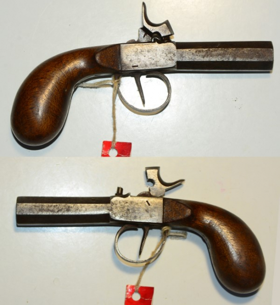 Terzerol mit Perkussionsschloss, 6-eckiger 6,2 cm langer Lauf, Gesamtlänge 16,9 cm, Kaliber 10,5 mm, schöner Zustand mit Alterspatina und funktionell