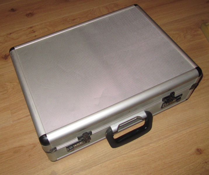 Gebruchsspuren rundum, aber noch gut brauchbar. Die (schon etwas schäbigen) 2 Schaumstoff-Noppenmatten sind nur eingelegt, die können also leicht entfernt/ersetzt werden. Nutzbares Innenmaß: 45x30x10cm. Da passen auch 2 Kurzwaffen rein. Außenmaße in alle Richtungen 3cm mehr. Die beiden Zahlenschlösser haben innen kleine Hebelchen, mit denen sich die Zahlenkombi jeweils einzeln für die 2 Schnappverschlüsse frei wählen lässt.