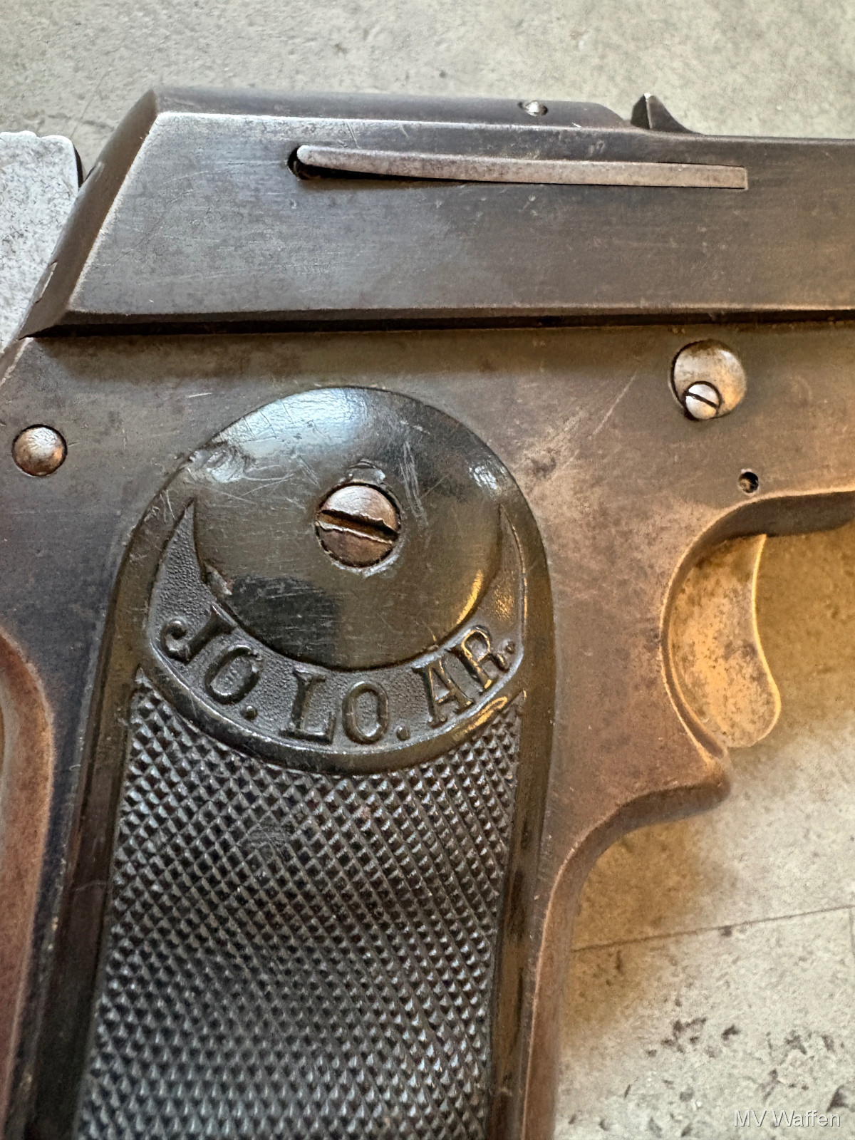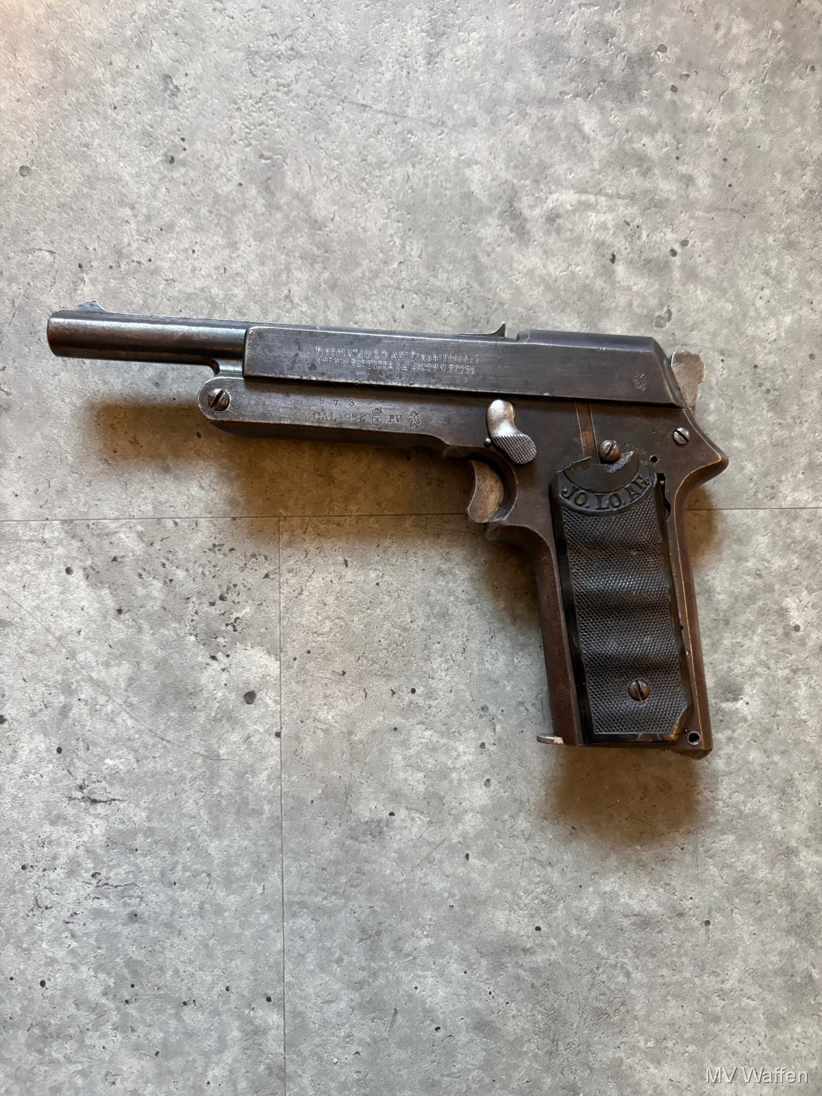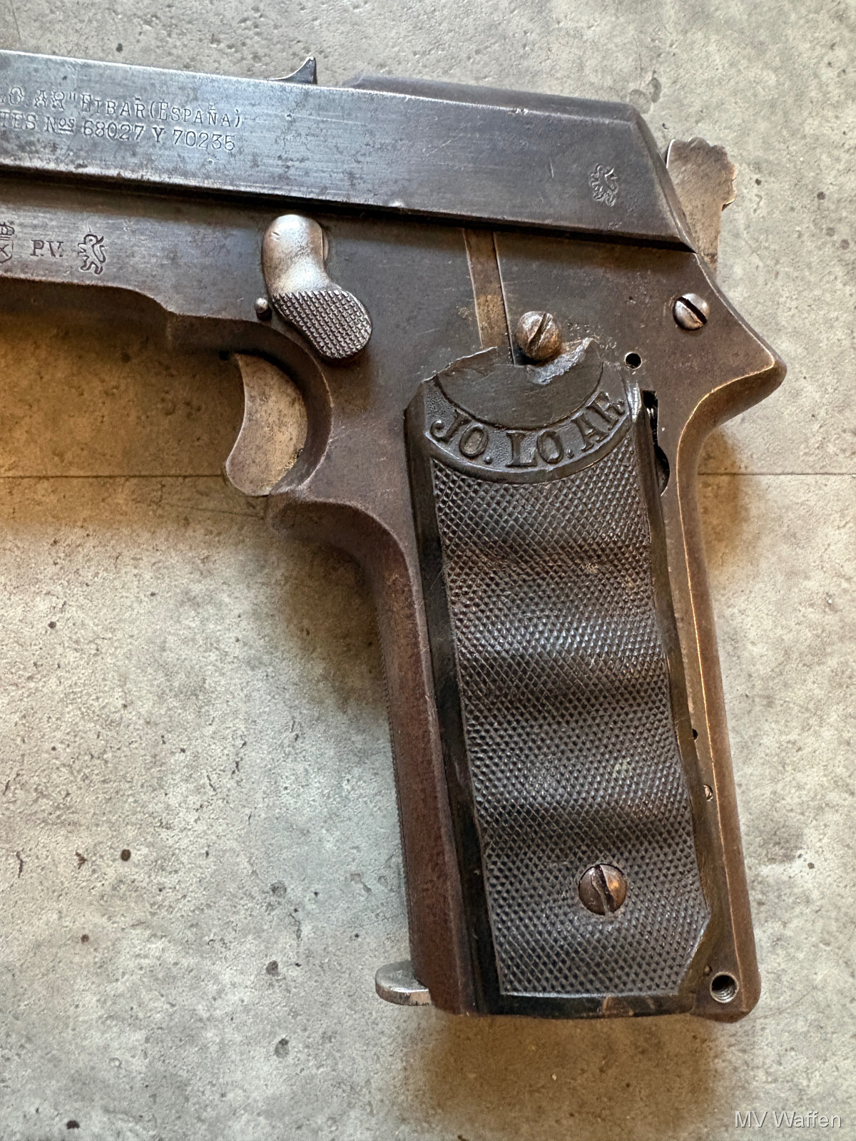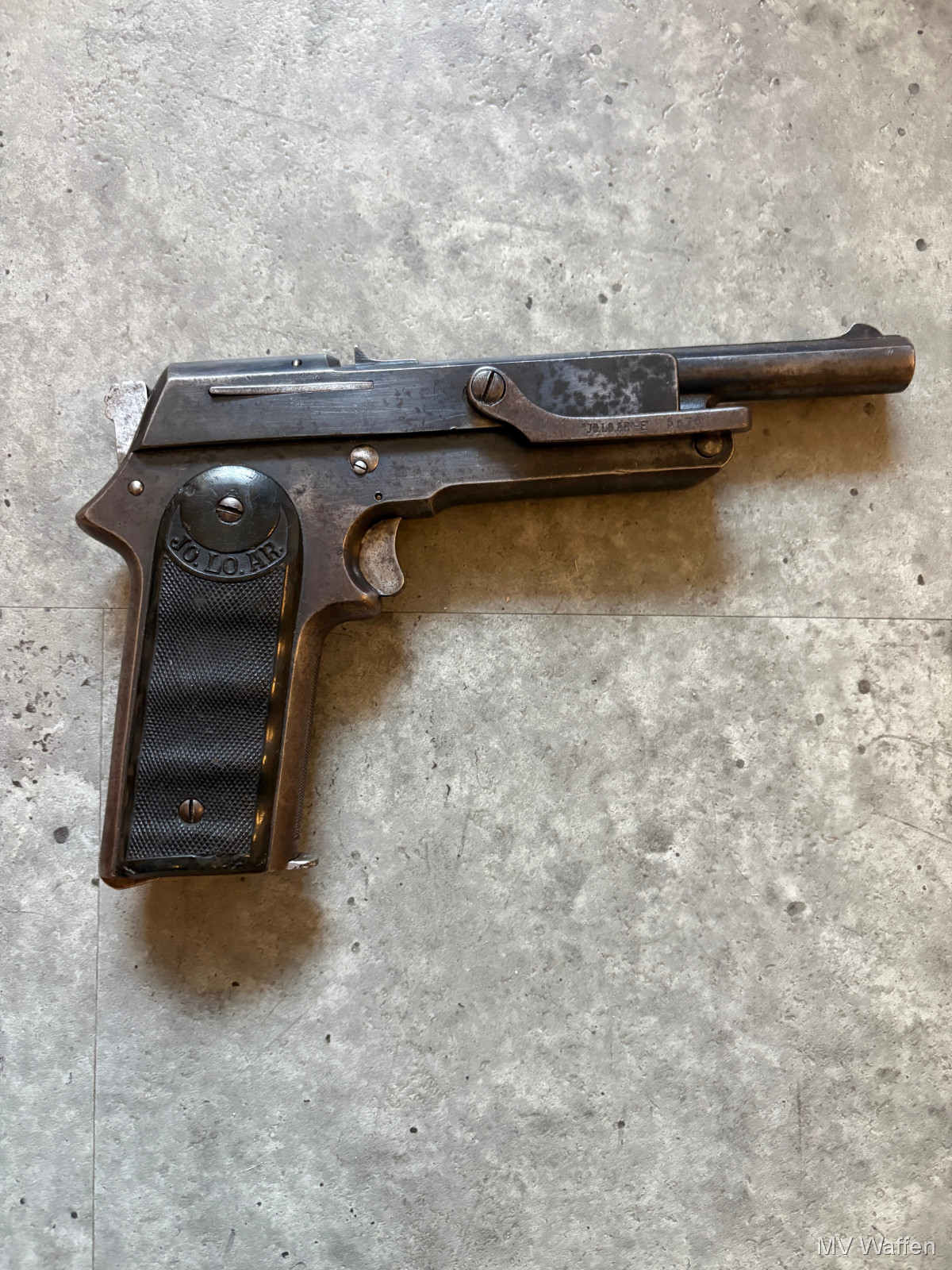 Ultra seltene Jo.lo.Ar Pistola Eibar in 9mm Largo. Die Pistole ist ein Einhandspanner mit Kipplauf und Magazin. Alle Funktionen gegeben. Gedacht für Berittene Soldaten, die nur eine Hand zu Verfügung hatten. Gesamtproduktion gerade mal 30000 in alle Kalibern. 9mm Largo sehr sehr selten. Linke Griffschale leider gebrochen. Zuschlagen bei der Gelegenheit. Direktversand an Europäische Händler möglich. Fragen Sie bitte nach den Versandkosten. Wie immer völlig unbearbeitet um Ihnen einen ehrlichen Eindruck des Zustandes zu ermöglichen.. Diese Sammelwaffe kann natürlich gerne, nach vorheriger Absprache in Wolfratshausen besichtigt werden