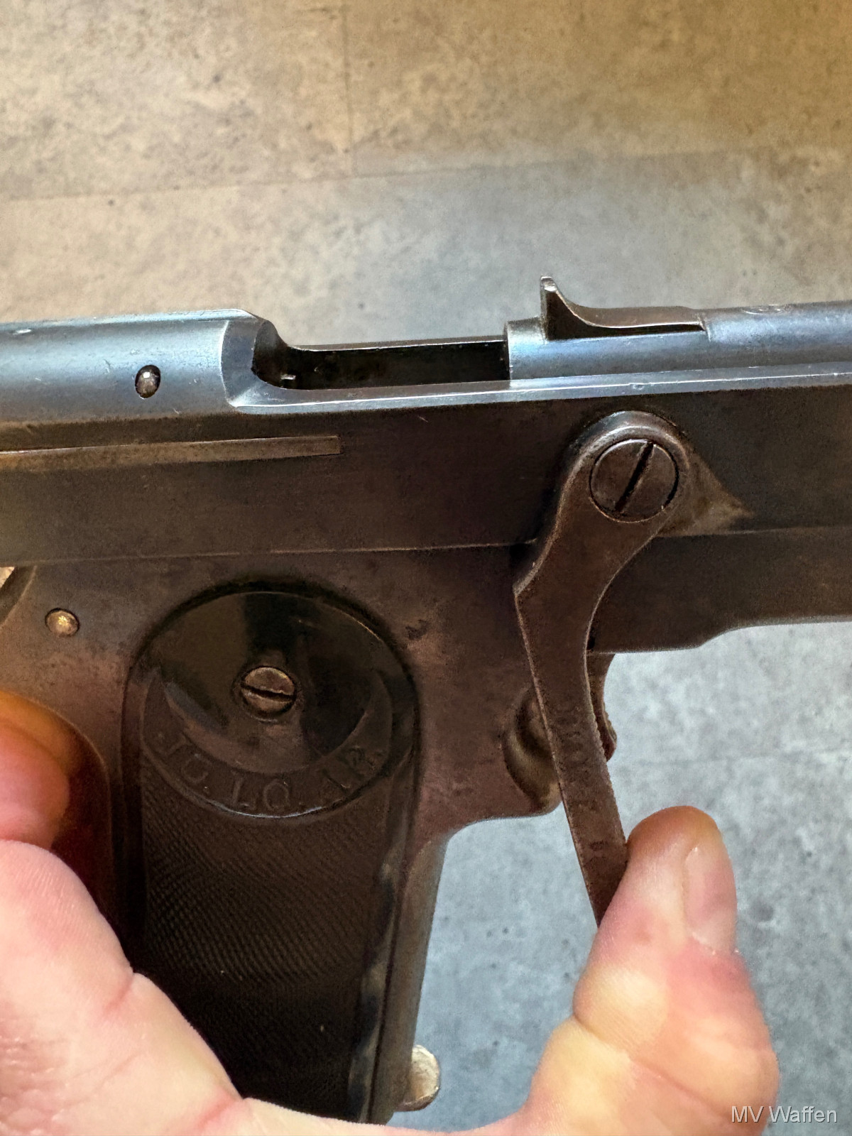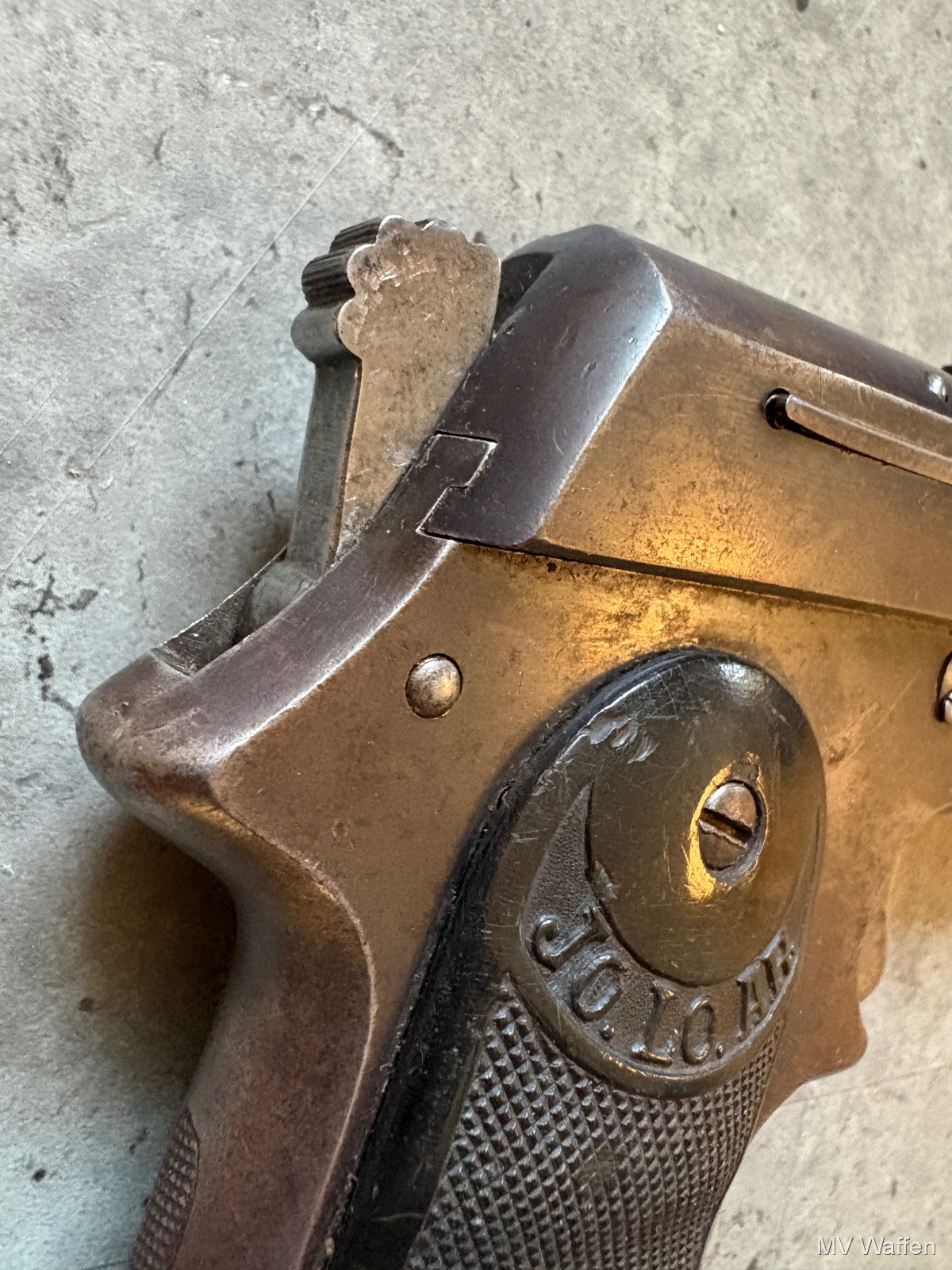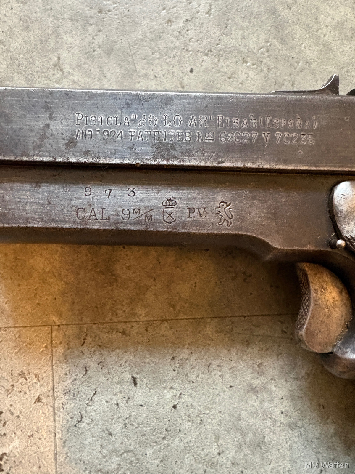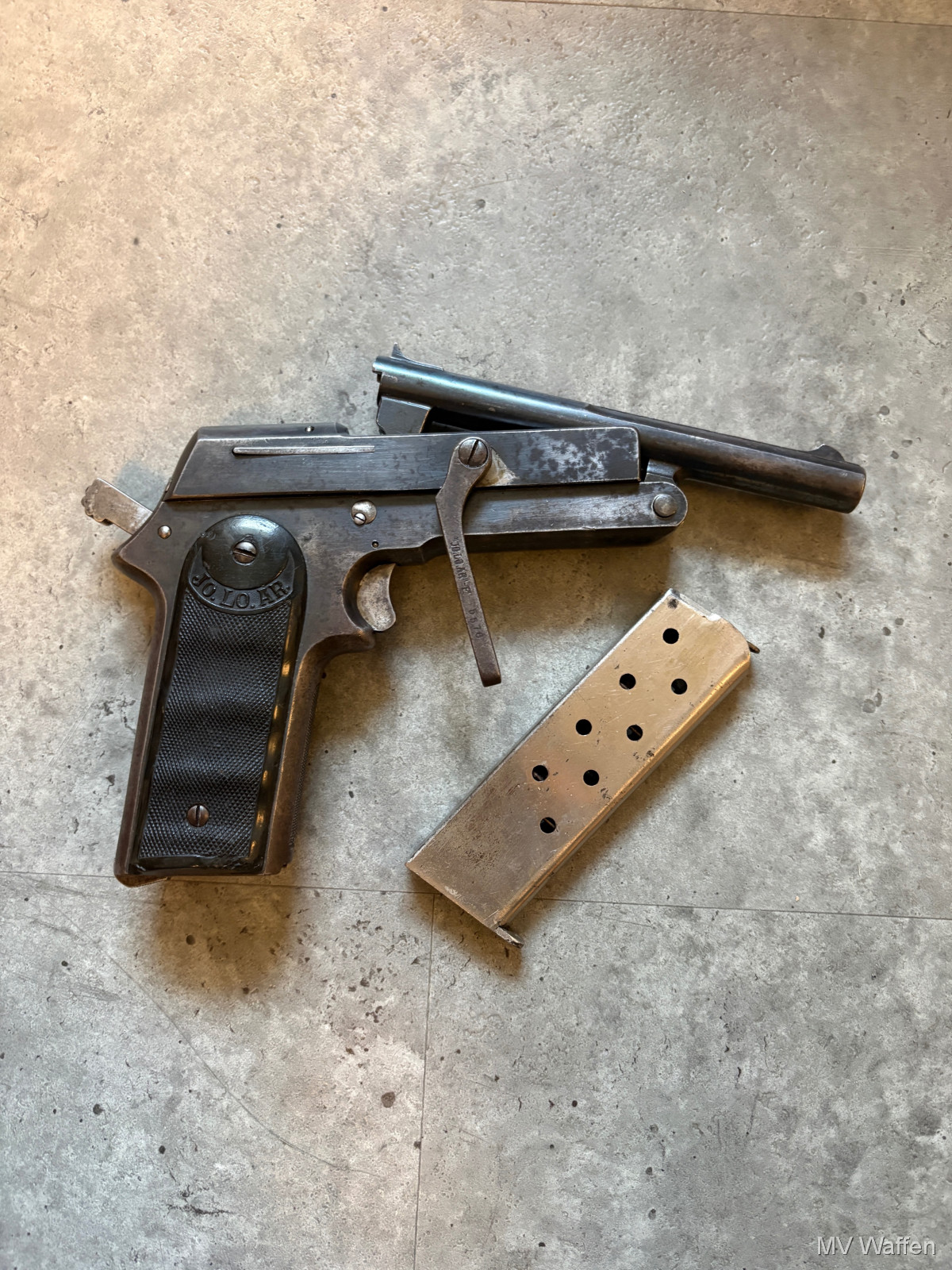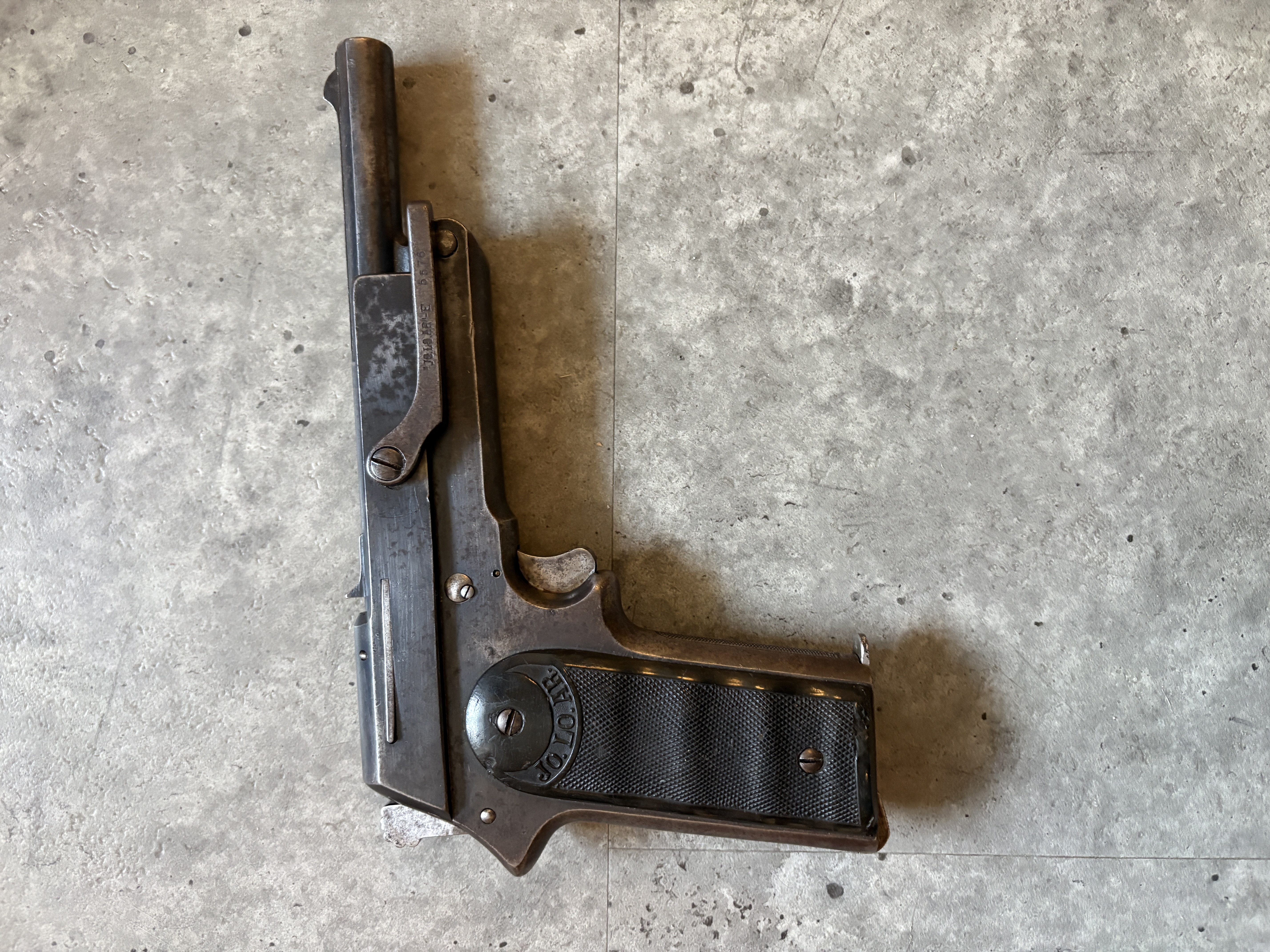 Ultra seltene Jo.lo.Ar Pistola Eibar in 9mm Largo. Die Pistole ist ein Einhandspanner mit Kipplauf und Magazin. Alle Funktionen gegeben. Gedacht für Berittene Soldaten, die nur eine Hand zu Verfügung hatten. Gesamtproduktion gerade mal 30000 in alle Kalibern. 9mm Largo sehr sehr selten. Linke Griffschale leider gebrochen. Zuschlagen bei der Gelegenheit. Direktversand an Europäische Händler möglich. Fragen Sie bitte nach den Versandkosten. Wie immer völlig unbearbeitet um Ihnen einen ehrlichen Eindruck des Zustandes zu ermöglichen.. Diese Sammelwaffe kann natürlich gerne, nach vorheriger Absprache in Wolfratshausen besichtigt werden