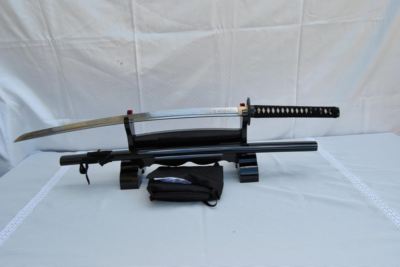 Wunderschöne Handgeschmiedete/ Gefaltete Last Samurai Schwert aus aller besten Stahl 1095 die durch das harmonische Zusammenspiel mit Saya und Tsuka zu einem vollkommenen Kunstwerk gemacht wurde. Das Schwert wird mit Schwertbeutel geliefert. Die gesamte Länge des Schwertes ist 104cm, die Klingenlänge 73cm und der Griff ist 28cm lang.Klingenbreite: 3,2 cm cm Klingenrücken: 8 mm Die Saya ist Schwarz lackiert. Die Zubehörteile haben ein Last Samurai Design und sind aus Metall, der Habaki ist aus massiven Messing. Der Griff ist aus Holz und in Rochenhaut eingelegt. Es handelt sich jedoch nicht um ein Paul Chen Erzeugnis. Das Schwert wird von einem Schwertschmied mit langjähriger Erfahrung in Handarbeit kunstvoll gefertigt und nicht wie bei anderen Herstellern mit Hilfe von Maschinen hergestellt. Jedes einzelne Schwert wird von dem Schmied auf traditionelle Weise und mit höchster Sorgfalt angefertigt. Dieses Schwert ist nicht nur ein Kunstwerk das in höchstem Maße dekorativ ist, sondern es ist auch sehr scharf und vollkommen geeignet für echte Kämpfe und Schnittübungen. Es zerteilt mühelos armdicken Bambus oder gleitet nahezu unspürbar durch ein Blatt Papier. Wird nach traditioneller Weise gehärtet und hat an der Schneide eine Rockwellhärte von 60 Grad und am flexibleren Rücken eine Härte von 40 Grad Rockwell. Die Klinge besitzt eine BO-HI.Die Klinge ist, zwecks Größerer Sicherheit, mit zwei mekugi (Bambus Zapfen) befestigt. .OHNE STÄNDER