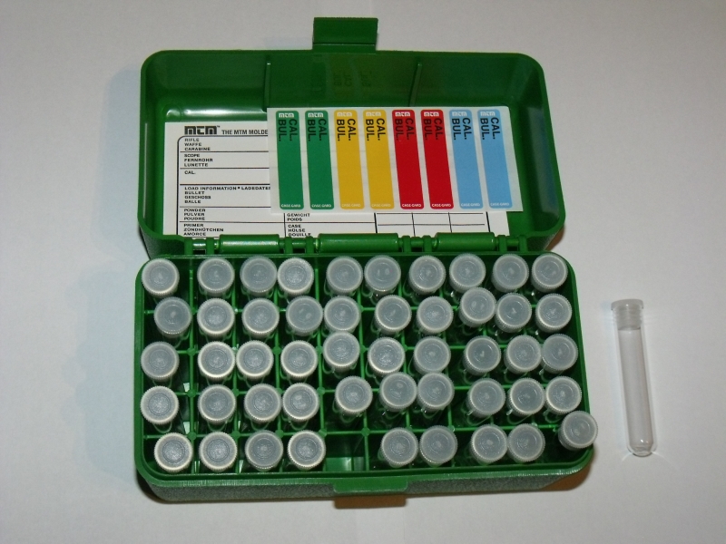 Angeboten wird eine MTM - Box mit 50 Pulverröhrchen. Die Box ist abriebfest und hat eine strukturierte Oberfläche, dieses verbessert die Griffigkeit der Box. Der Klappdeckel ist mit einem stabilen Scharnier versehen. Die stabilen Rundbodenröhrchen sind aus Glas, 60 x 12 mm, einer Wandstärke von 0,6 mm, verschmolzenem Rand und Lamellenstopfen, das Fassungsvermögen beträgt ca. 65 Grain Pulver. Das restlose Entleeren der Röhrchen ist problemlos, es bleibt kein Krümel Pulver im Glas, da es antistatisch ist. Das Fassungsvermögen beträgt ca. 65 Grain FFG Pulver.