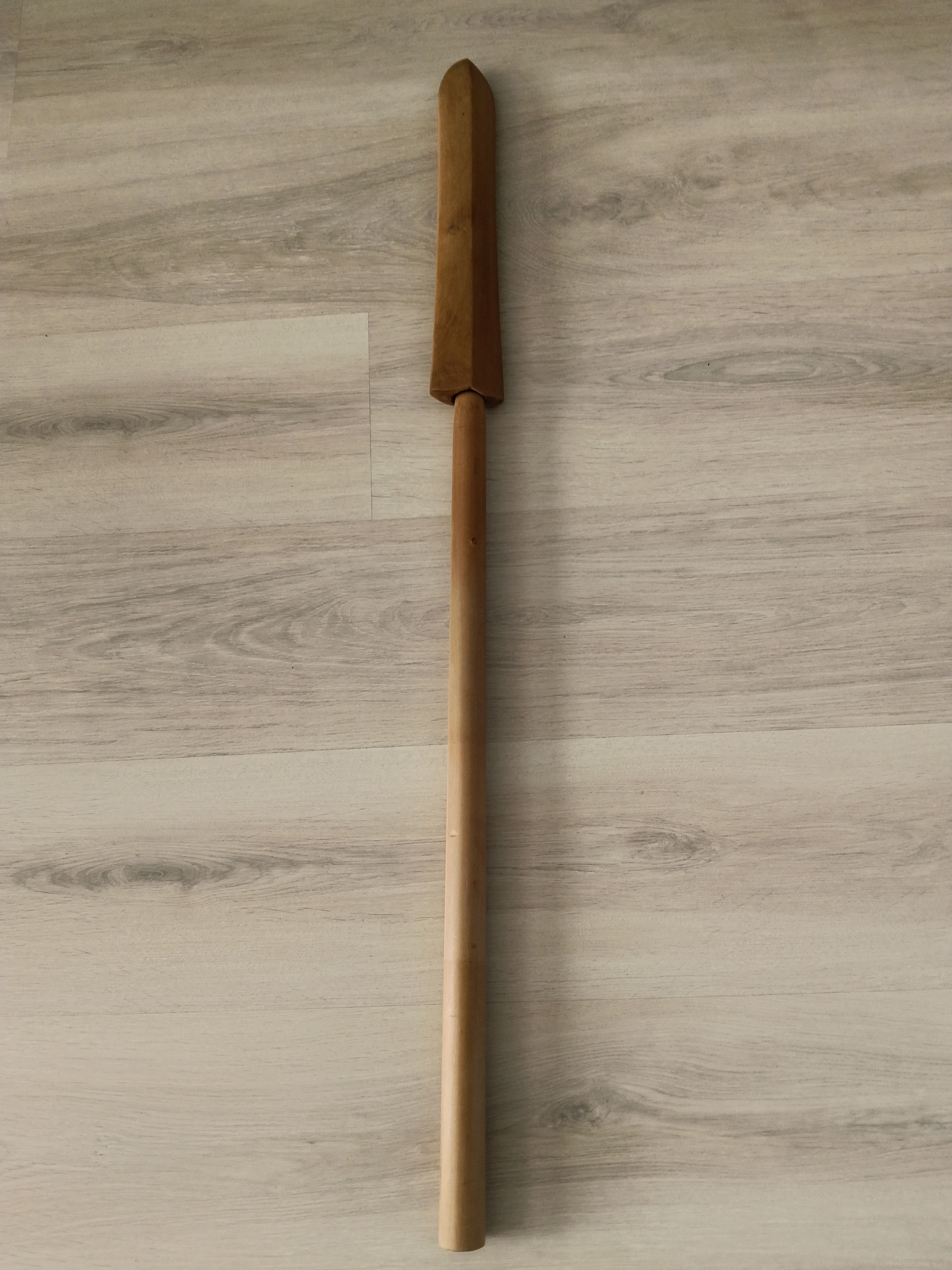 Antieke Japanse speer (sankaku yari 三角槍, "driehoekige speer" ) in shirasaya . Nakago is gesigneerd " Yamashiro ...kuni ...", maar niet volledig leesbaar. Een sankaku yari had een punt die leek op een smalle stekel met een driehoekige doorsnede. De sankaku yari was het beste geschikt om pantser te doorboren, zelfs pantser van metaal, waar een standaard yari minder geschikt voor was. Heel goede verzamel staat, blade lengte 26.5 cm, blaad breedte 2.7 cm, totale lengte in shirasaya 84.5 cm. Kopie van torokuscho inclusief.