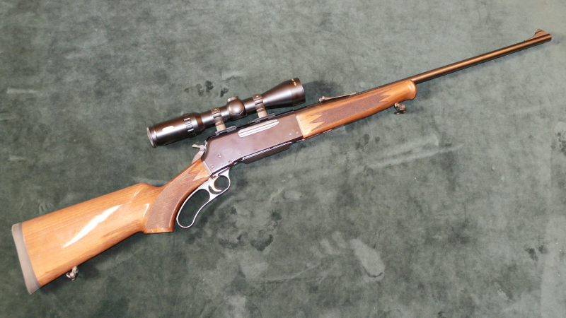 Browning Mod. BLR Take down, Kal. .30-06Spr., Take down Unterhebelrepetierer mit herausnehmbarem 5-Schuß-Magazin, per Weavermontage ist ein Tasco Titan 1,5-6x42 mit Absehen 4 (unbeleuchtet) montiert, altersgemäß guter Zustand, leichte Gebrauchsspuren im Lackschaft. Schußleistung sehr gut, siehe Bild: 5 Schuß mit Geco 11,0g TM auf 100m. Lauf innen blank, Lauflänge 56cm, Schaftlänge 36cm, Gesamtlänge 108,5cm.