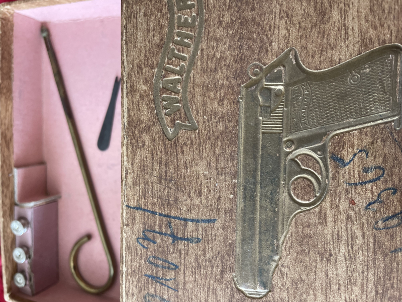 Biete einen alten Pistolenkarton von Walther für die PPK. Die Schachtel ist dem Alter entsprechend gebraucht. Auf der Schachtl sind mit Bleistift Markierungen geschreiben.