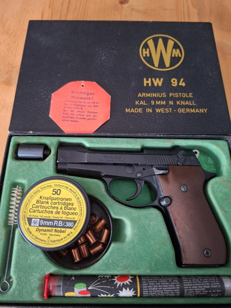 Biete hier eine HW 94 mit der ersten PTB 467 im Full Set an, mit dabei, Pistole, ist fast ungeschossen so wie sie aussieht, Pyroabschußbecher, einige Patronen in 9 mm R., einige Leuchtkugeln, ein Putzbürstchen, Nummerngleiche Verpackung in gutem Zustand,
