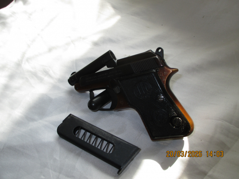 Hier eine seltene Beretta Pistole Mod. 1950 Kal. 6,35 bei der Waffe kann der Lauf abgekippt werden um eine Patrone ins Lager zu laden zusätzlich hat diese ein Magazin und läd selbst nach, natürlich kann man die Waffe auch fertig laden und feuern. Der Zustand kann als Neuwertig bezeichnet werden. Lieferung in die EU möglich über Deutschen Händler Export. Gebrauchtwaffe keine Garantie.
