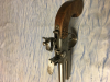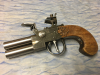 Replika einer doppelläufigen Steinschlosspistole im Cal. 10mm. Kastengröße 20x25 cm. Im Kasten befindet sich eine Pulverflasche und ein Schlüssel zum entfernen der Läufe. Zum Laden werden die Läufe mit dem Schlüssel herausgeschraubt, Pulver in den Pulversack gefüllt und die Kugel in den abgenommenen Lauf gegeben .(Kugeldurchmesser 0,02 MM größer). Pulver auf die für beide Läufe geöffnete Pfanne geben und drehen auf den obersten Schuss .Nach dem ersten Schuss drehen der Pfanne zum Schuss des untern Laufes. Schaft ist aus Nussbaumholz