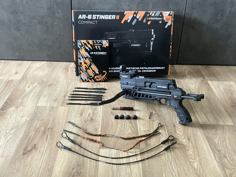 Verkaufe meine Steambow AR-6 Stinger II Compact Pistolenarmbrust inkl. Originalverpackung und umfangreichem Zubehör.