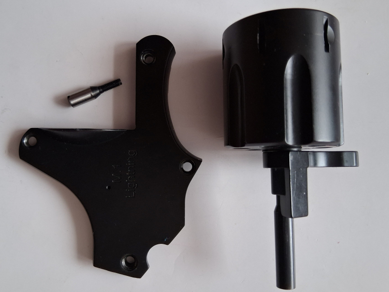Stahl-Trommel komplett zusammen mit Achse, Trommelhalter und Zapfenschraube plus Deckplatte für Schreckschuss-Revolver Mercury M.1 Lightning.