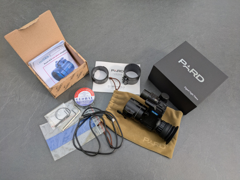 Pard digitales Nachsatz-Nachtsichtgerät NV007S, 940nm, im Originalkarton mit entsprechendem Zubehör (s. Bild), inkl. 1x Pard Akku 18650 und zus. Rusan Adapter ARPNV7S-43.