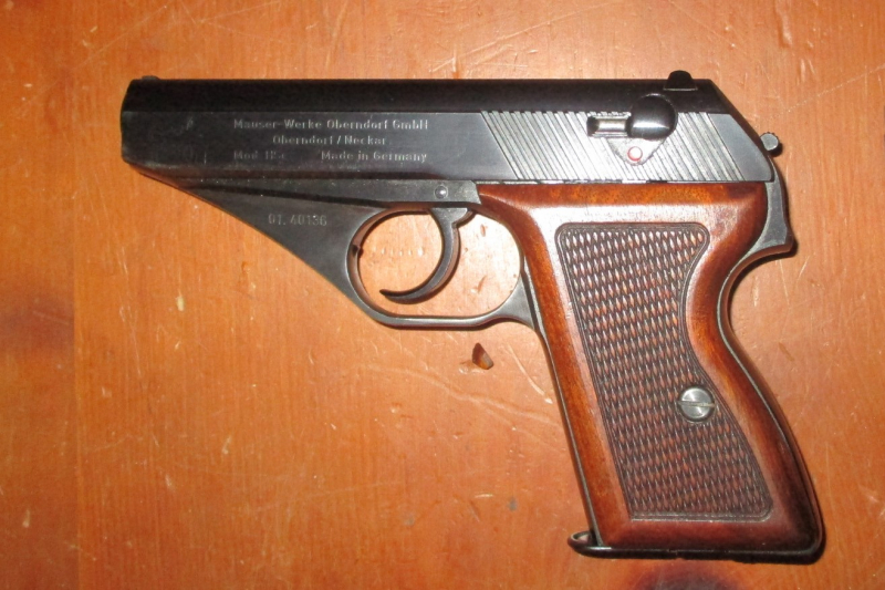 neuwertige Mauser HSC, 9mm kurz, wohl nie geführt und nur zum Beschuss geschossen, minimalste Lagerspuren, lediglich linke originale Holzgriffschale vorn : winziges Stück gelöst ( liegt bei ).