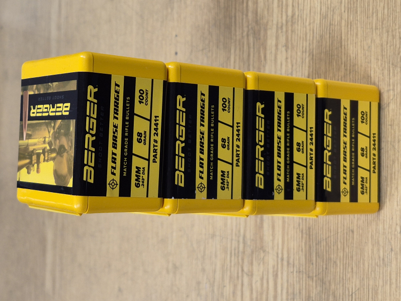Verkaufe überzählige Geschosse: Berger Flat Base Target, 6mm, 68 gr.,#24411, 400 Stück, Packungen sind ungeöffnet.