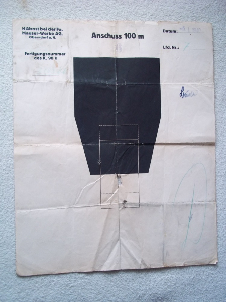 Achtung! Rarität! Sammler " K 98 k"!! Sie bieten auf eine originale Anschußscheibe der HAbnst bei der Fa. Mauserwerke AG Oberndorf a. N. Die Scheibe wurde am 5.1.1940 beschossen. Die Fertigungs-Nr. der Waffe ist nicht genau zu identifizieren. Die Scheibe ist gefaltetund an den Rändern leicht eingerissen. Größe: 51,5 x 41,5 cm. Privatverkauf ohne Garantie und Rücknahme! Auf eigenen Wunsch und Risiko Versand als "Päckchen" € 5.-