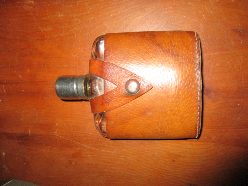 Gläserne Flasche mit Leder überzogen, abschraubbarer Becher, geringste Gebrauchsspuren,