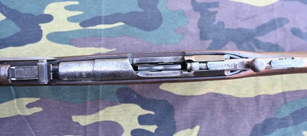 Hingegen schöner Schaft aus Schichtholz, etwas raue späte Kriegsfertigung, mit normalen Gebrauchsspuren, Waffe und Schloss nummerngleich. Visierschieber fest, evtl. unsichtbar fixierte Verschiebbarkeit, wie das früher einmal laut Waffengesetz Vorschrift war. Zu sehen ist jedenfalls äußerlich nichts davon. Waffe ist ansonsten voll funktionsfähig.