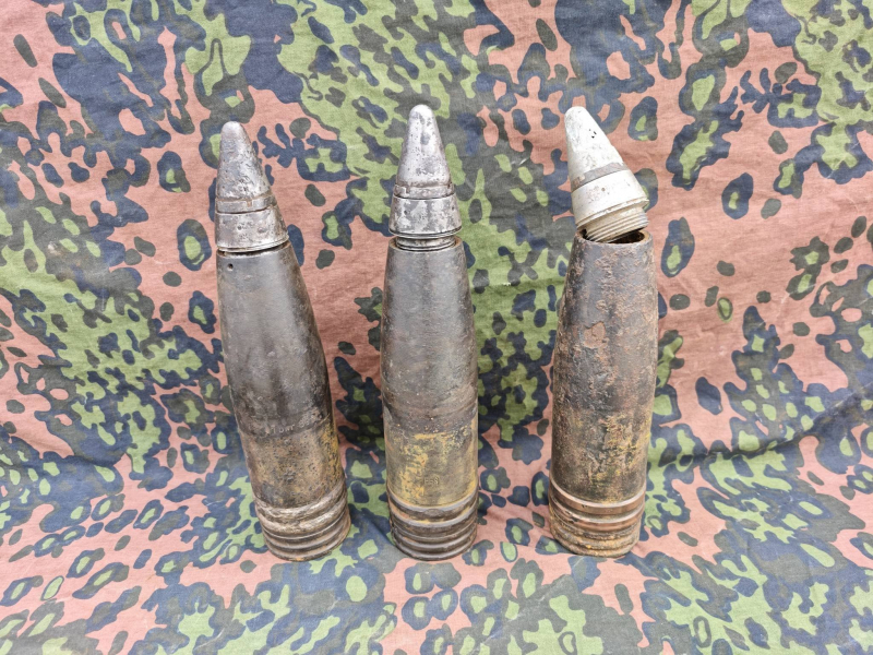 Satz aus drei originalen 8,8 cm Sprenggranaten (Sprgr.), verwendet in der berühmten 8,8 cm Flak 18 sowie in entsprechenden Kriegsmarine-Geschützen.