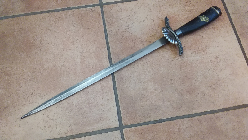 Hirschfänger mit Holzgriffstück,Gesamtlänge ca. 53 cm, Klingenlänge ca. 38 cm, Metallteile etwas fleckig,ebenso die Klinge, ungereinigter Fundzustand