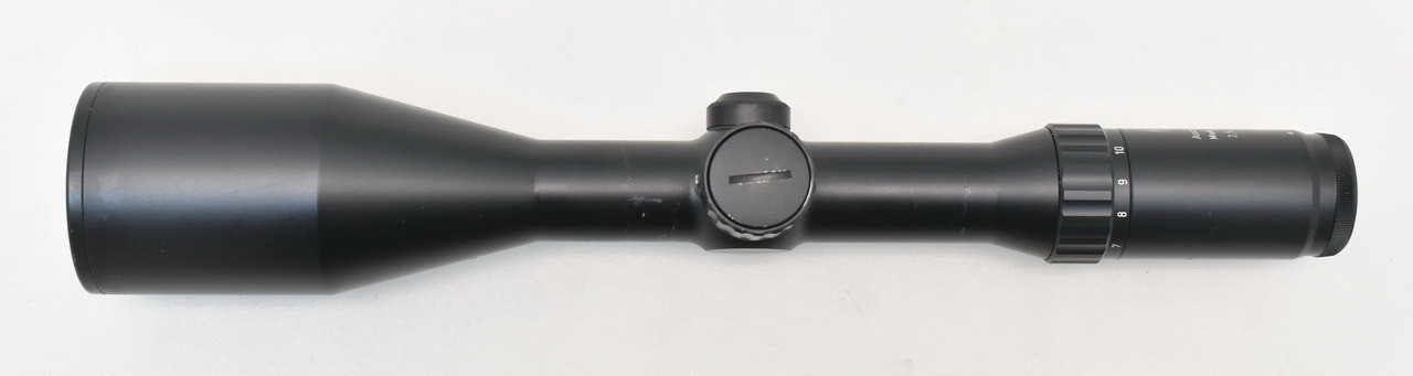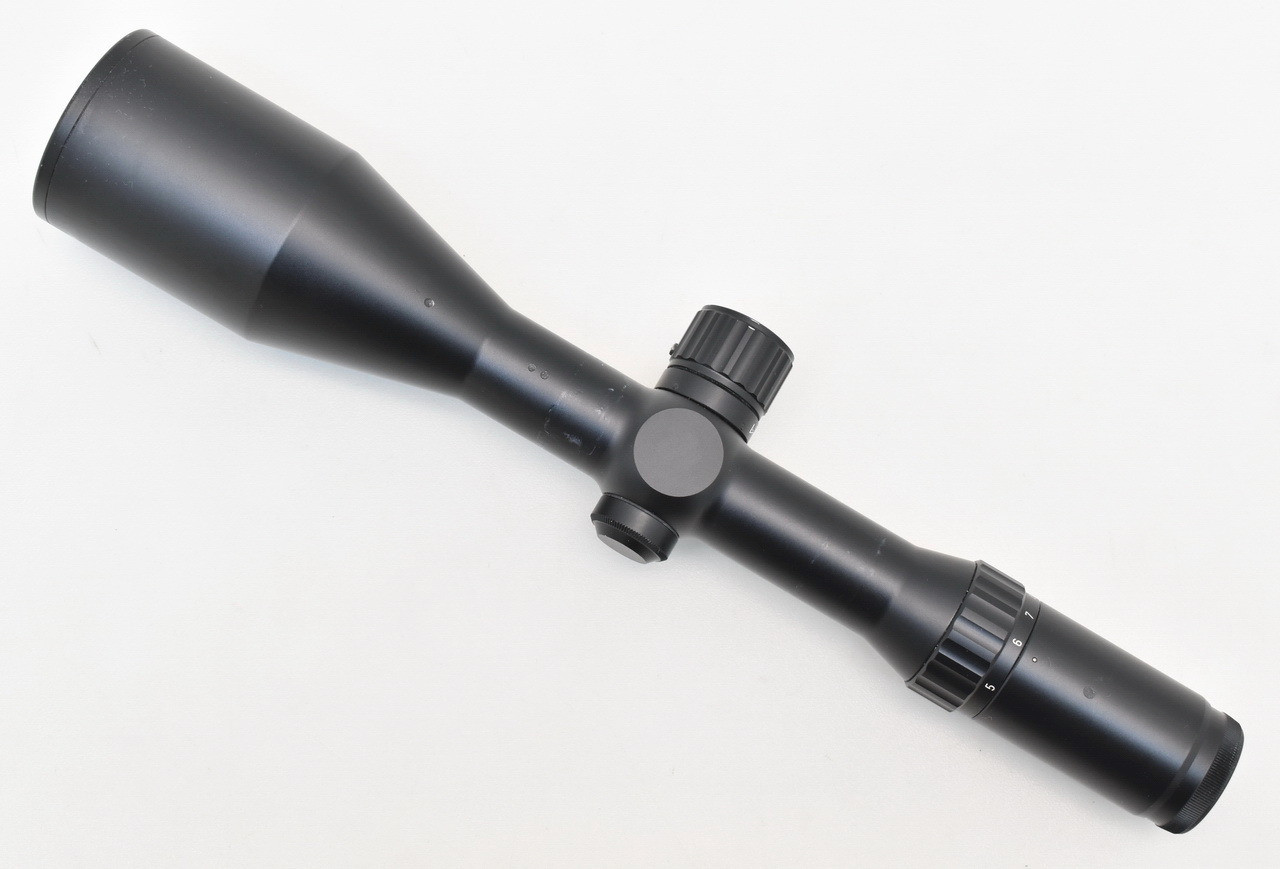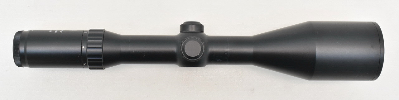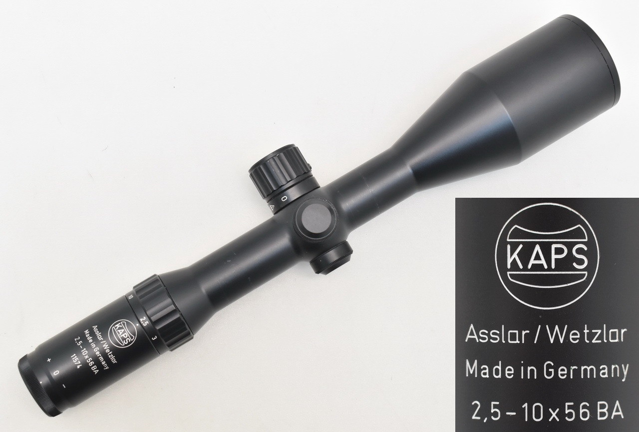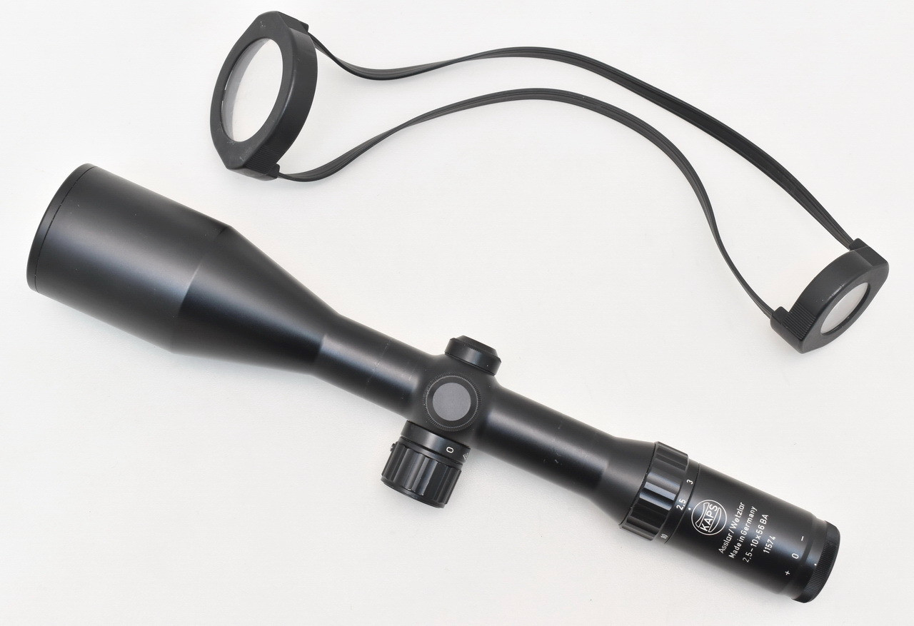 367mm lange und 690g schwere, variable Zieloptik " Made inGermany " aus Produktion der Karl Kaps GmbH & Co. KG, Asslar. Mehrschicht vergütete Präzisionsoptik. Objektivaußendurchmesser 62,1mm. Gesichtsfeld auf 100 Meter: 4,2 - 12,4 m. In der 1. Bildebene gelegenes Leuchtabsehen 5 ( Leuchtpunkt ). Stufenlos dimmbar. Abschaltautomatik nach ca. 6 Stunden. Robuster, aus einem Stück gefertigter Leichtmetall Rohrkörper mit 30mm Mittelrohrdurchmesser. Spritzwasser- und staubdicht. Okular- und Objektivlinse kratzerfrei. Gebrauchs- und Montagespuren siehe Bilder.